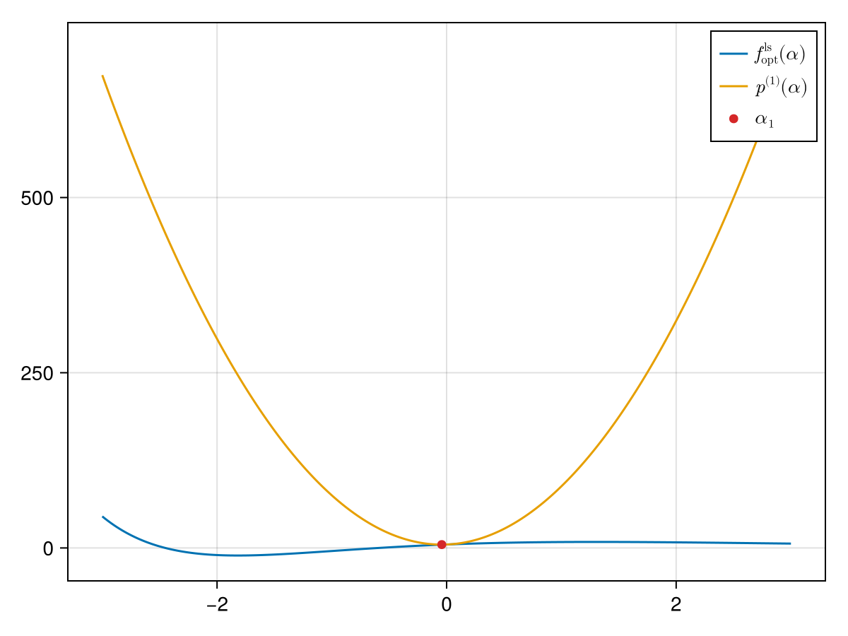 Note the different shape of the line search problem in the case of the optimizer, especially that the line search problem can take negative values in this case!