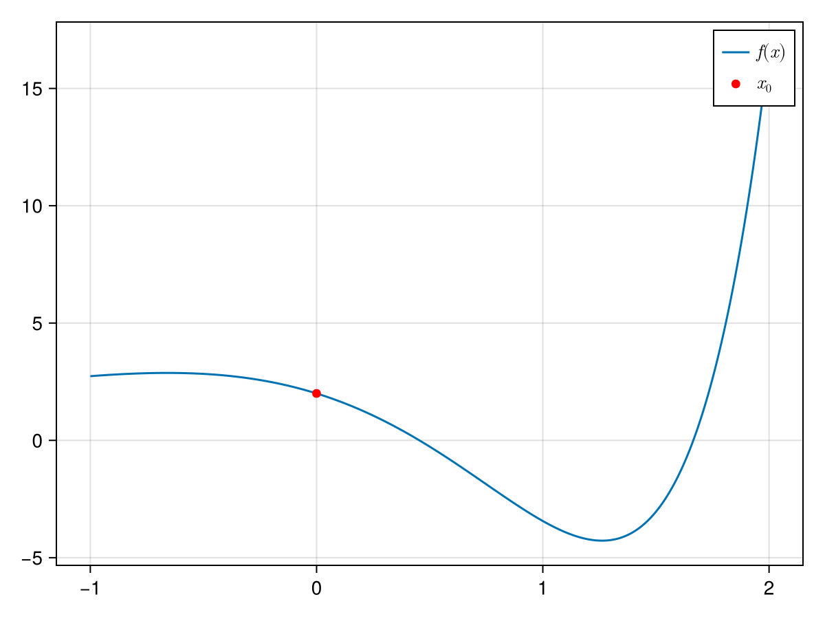 We now want to use quadratic line search to find the root of this function starting at $x = 0$. We initialize a line search problem: