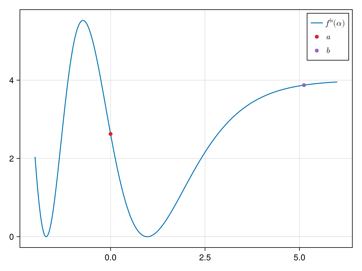∂fˡˢ∂α(alpha) = ls_obj.D(alpha, params)We now try to find a minimum of $f^\mathrm{ls}$ with quadratic line search. For this we first need to find a bracket; we again do this with SimpleSolvers.bracket_minimum_with_fixed_point: