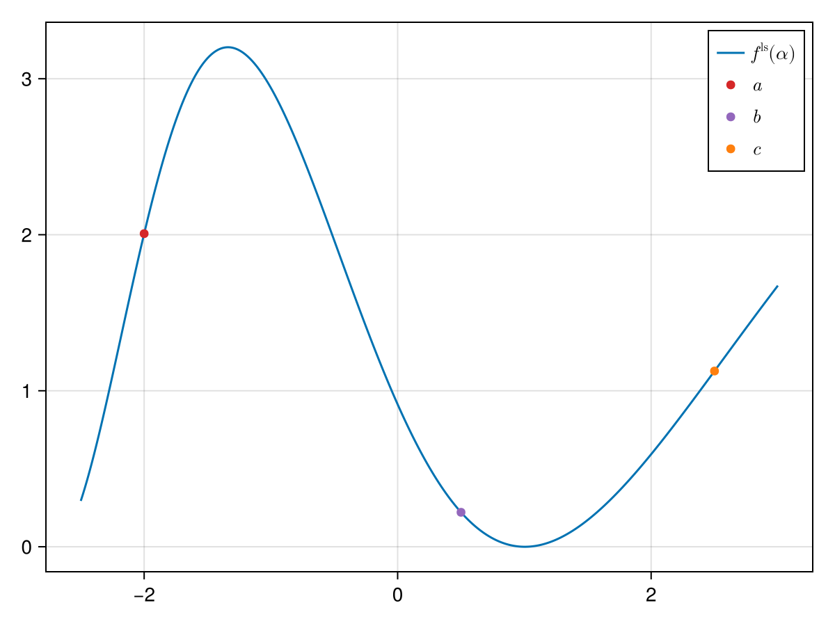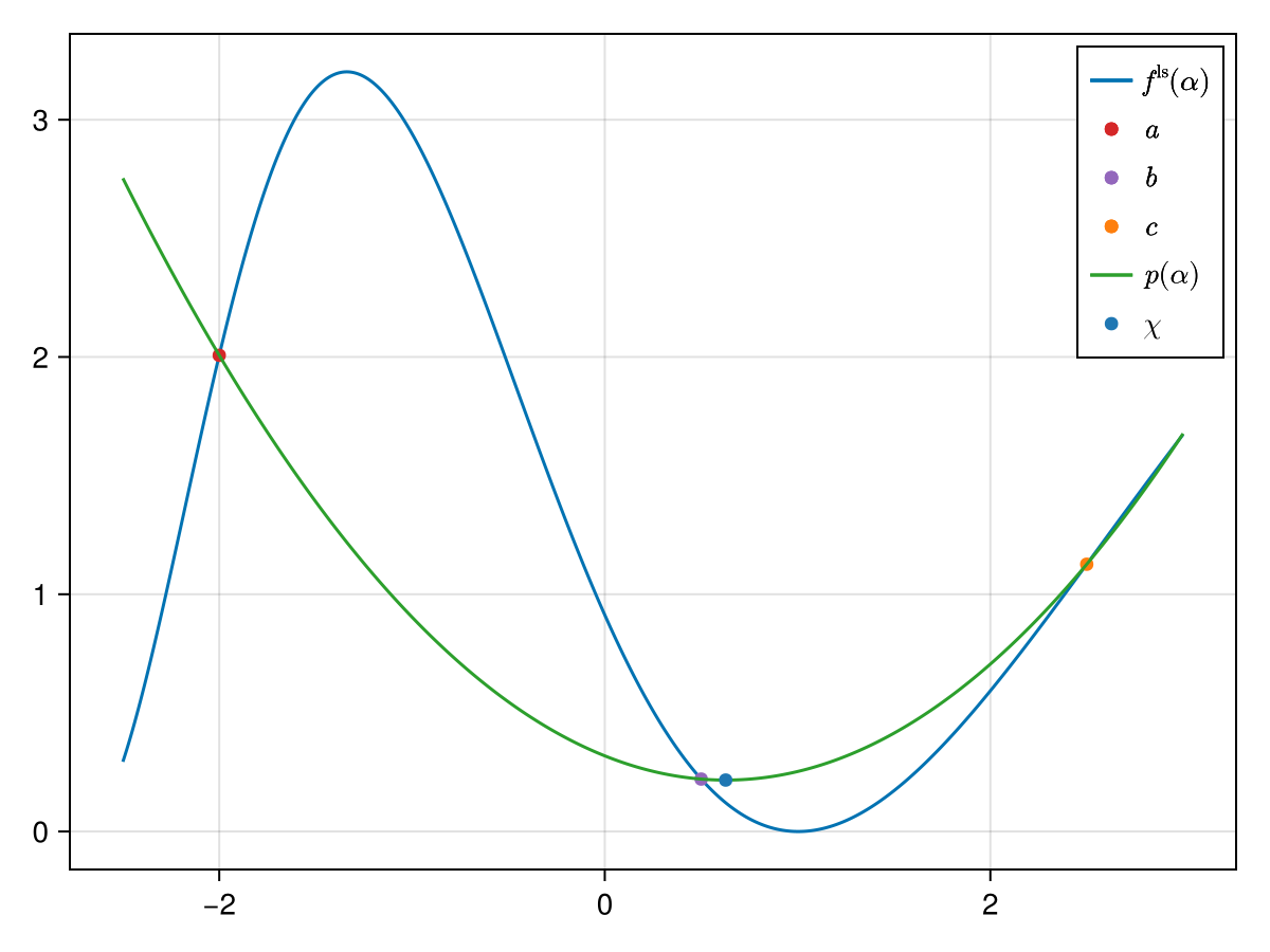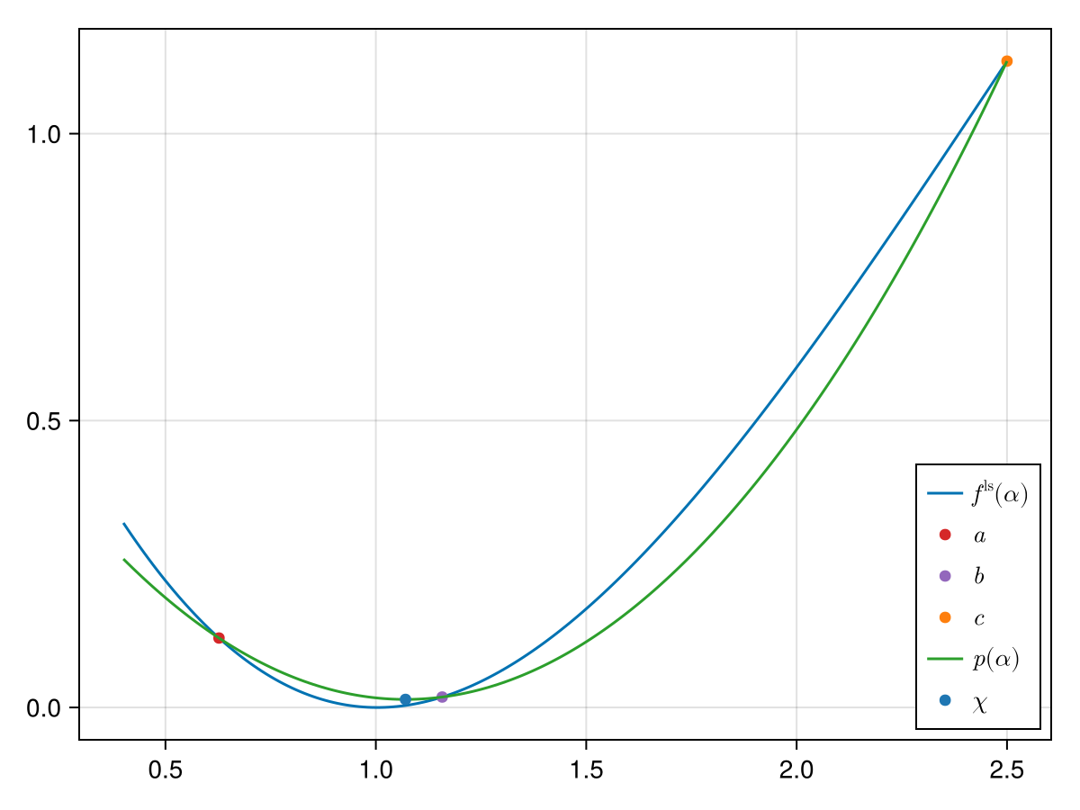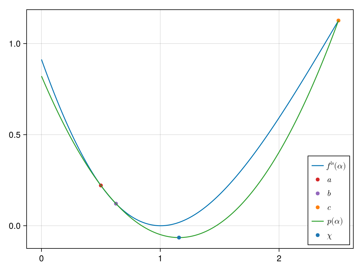 In the figure above we already plotted three points $a$, $b$ and $c$ on whose basis a second-order polynomial will be built that should approximate $f^\mathrm{ls}$.[1] The polynomial is built with the ansatz: