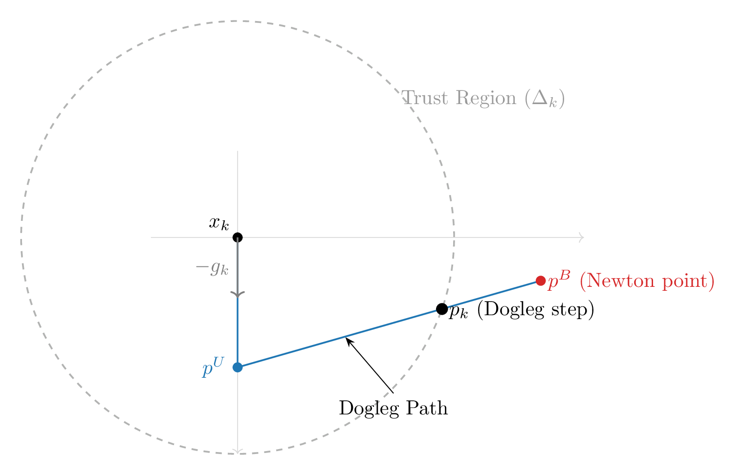 The Dogleg method is a more sophisticated approximation introduced by Powell [5]. It is particularly effective when the Hessian $B_k$ (or its approximation) is positive definite. It constructs a piecewise linear path from the origin to the unconstrained Newton point.